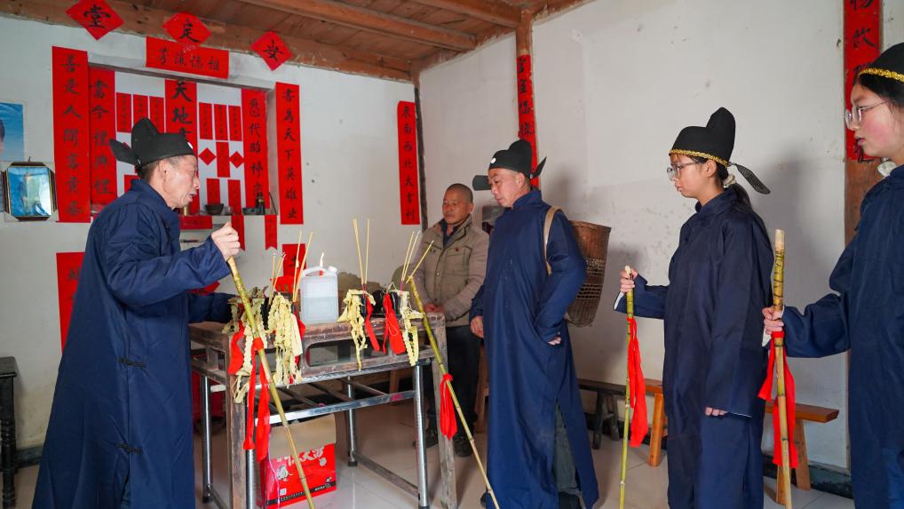 贵州石阡县的“春官”们在农户家举行“说春”仪式。(新华社发 夏磊 摄)