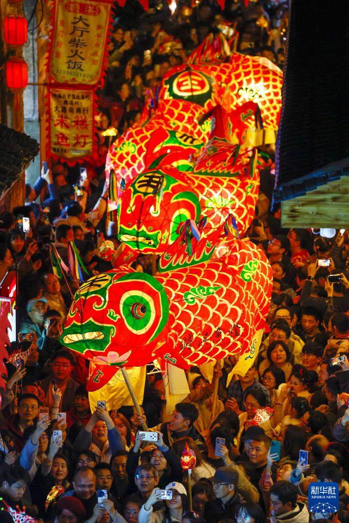 2月14日,在安徽省黄山市歙县北岸镇瞻淇村,鱼灯表演队在街巷中巡游。