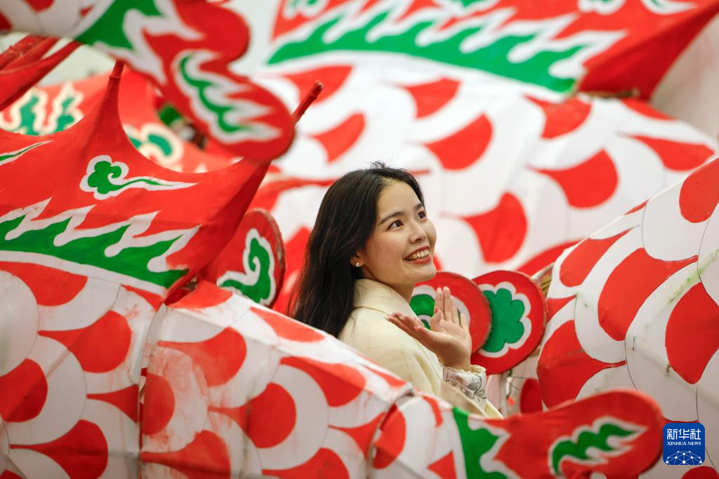 2月28日,在安徽省黄山市歙县徽城镇渔梁社区,渔梁鱼灯非遗传承人徐继丽在展示自己制作的鱼灯。
