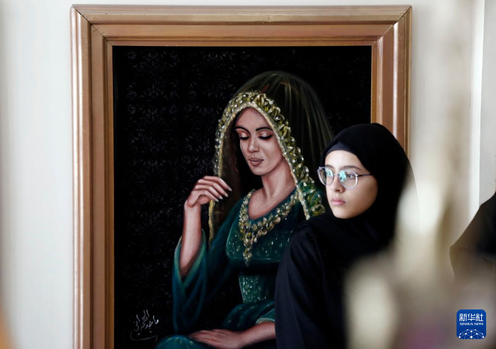 4月14日,在也门首都萨那,一名女孩参观艺术展上的画作。