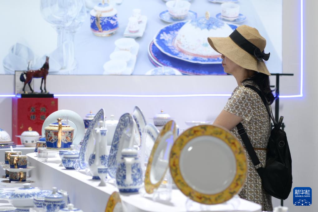 4月15日,在第六届消博会国货精品展区,观众在了解景德镇瓷器产品。