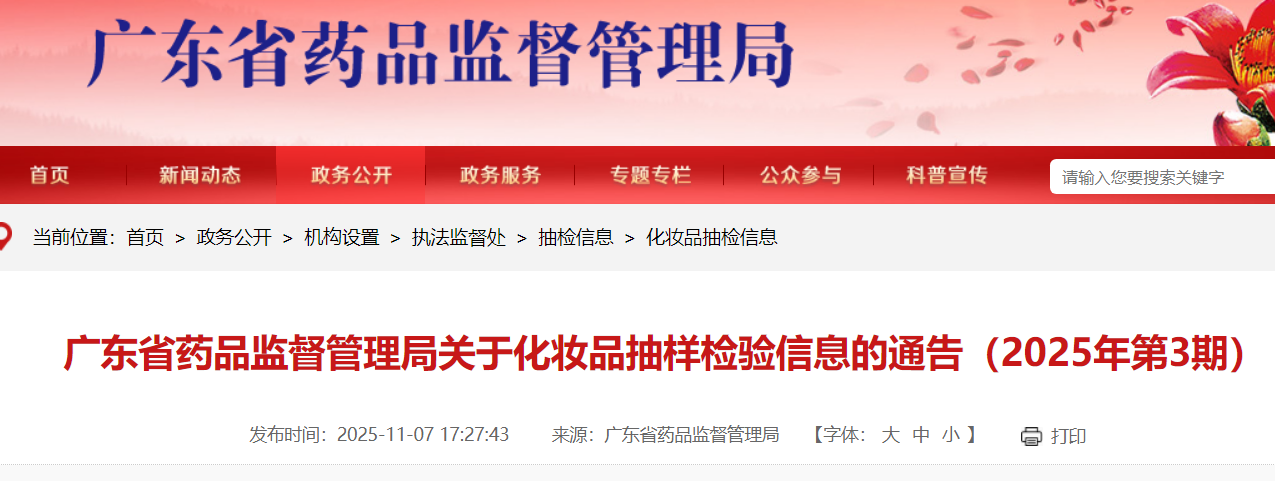 为加强化妆品监管,保障公众用妆安全,根据广东省化妆品抽检计划,广东省药品监督管理局组织对全省化妆品生产经营环节进行化妆品抽样检验,现将化妆品抽样检验信息予以通告(见附件)。