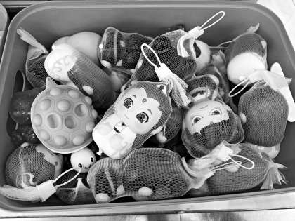 丰台区百荣世贸商城二期四层是玩具批发集散地,在这里,几乎每家批发店铺的货架上都堆放着各式各样的“捏捏乐”。其中一家店铺将五筐“捏捏乐”玩具摆在店铺进门最显眼处,有卡皮巴拉、哪吒、敖丙、大熊猫等流行卡通造型,总数不下百个。但记者发现,这些“捏捏乐”都只套着一个简易的网袋,没有任何产品标签、成分说明或生产厂家信息。