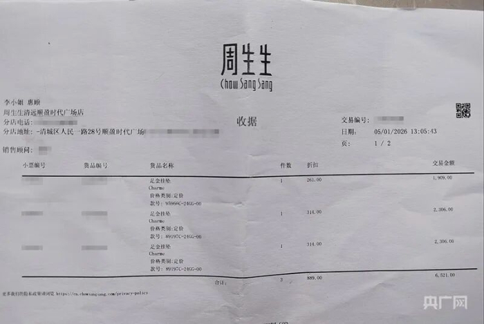 “我是今年1月5日在广东省清远市清城区远盈时代广场的周生生店购买的首饰,当时想着品牌大,品质有保障,没想到会出现这种问题。”李女士在接受记者采访时回忆说。据她介绍,当天她与妹妹一同前往该店,共购买了三款黄金饰品,其中她个人花费4215元,购入一个足金福袋挂坠(价格2306元)和一个足金小羊挂坠(价格1909元),妹妹则购买了一个同款足金福袋挂坠。
