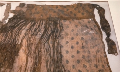 展览入口处不远有一件印金双凤穿牡丹百褶罗裙,也是首次展出的文物。这是黄昇入葬时穿在最外层的一条裙子,也是在南宋时期女子的盛服中必穿的褶裥裙,与之相搭配的是大袖以及霞帔。