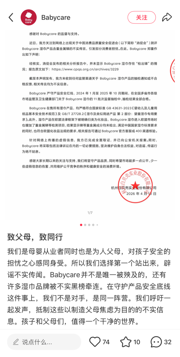 4月11日,国内头部品牌Babycare发布声明,辟谣近期社媒上传播的“消促会测评Babycare湿巾产品含重金属锑”等相关传言为不实信息。