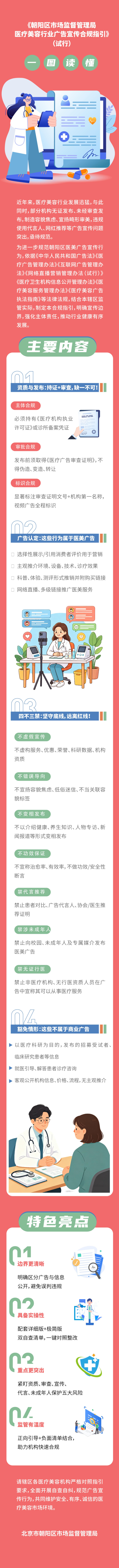 发布医疗美容广告不得宣扬容貌焦虑,不得将容貌出众与“高素质”“勤奋”“成功”等评价做不当关联,同时禁止使用患者名义或形象进行诊疗前后效果对比。4月23日,朝阳区市场监管局发布《朝阳区市场监督管理局医疗美容行业广告宣传合规指引》,这也是全市首个医疗美容广告专项合规指引。