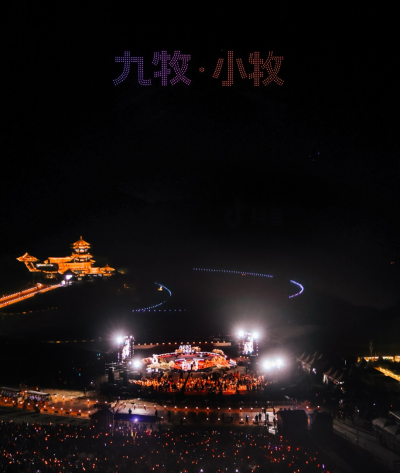 现场,随着上千架无人机在夜空中划出绚烂轨迹,一幅幅绝美景象在夜空中呈现,祝福来自五湖四海的人们中秋节快乐。特别是当无人机在夜空整齐排列出“九牧小牧”文字时,瞬间就把音乐季的氛围推向最高潮,整片沙海仿佛变成了一座光影交织、如梦如幻的星空剧场,让千年丝路的沧海故事和现代科技在每个游客心中激荡徘徊。