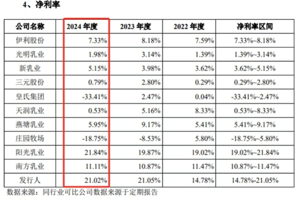 需特别指出的是,百菲乳业的净利率在同行业可比公司中表现突出。申报稿中,百菲乳业列举了10家同行业可比企业,这些公司2024年度的净利率均值仅为0.25%,远低于百菲乳业。其中,仅有阳光乳业的净利率与百菲乳业接近;剩余9家企业里,南方乳业的净利率最高,虽达11.11%,但与百菲乳业仍存在较大差距。