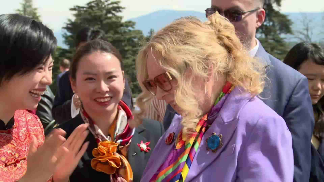 鲤城区委常委、宣传部部长陈颖为联合国日内瓦办事处总干事塔蒂亚娜·瓦罗瓦娅佩戴金苍绣胸针(鲤城区融媒体中心 供图)