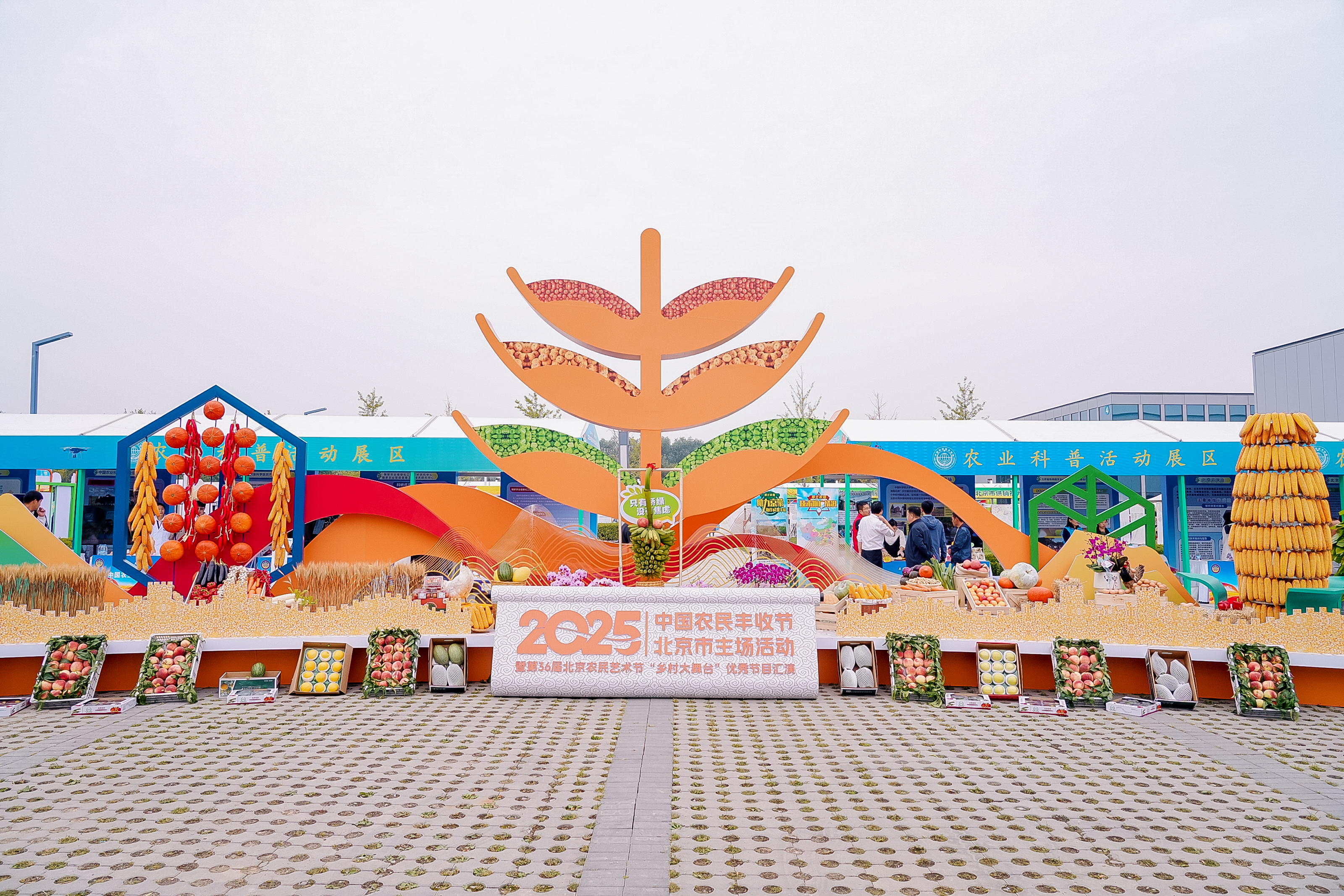丰收节主场活动以“庆农业丰收 享美好生活”为主题,现场精心设置了8大主题展区。在特色产品集中展示区,本地蔬菜、果品、畜禽等新品种纷纷亮相,新主体代表现场分享自己的创业故事以及带动周边农民增收致富经验;农业科普活动展区,将科创科普与科技兴农实践深度融合,搭建科技成果展示与科普实践平台;在通州展区,从现代农业、百千工程、种业产业和党建引领四方面介绍乡村振兴成果;在智慧农业和智能装备展上,伏羲农场、智能育种大模型、智慧植保系统等现场展示农业科技成果;在电商助农和金融助农展区,京东、盒马、物美多点等电商平台现场展示“从田间到餐桌”的全链路数字化助农模式,北京农商银行等多家金融机构展示助农服务案例;在第一书记风采展区,多张图片生动定格温暖助农瞬间;市供销社为农服务综合展区,多维度展示市供销社发挥服务网络遍布城乡的优势、服务城乡发展的实践成果;在丰收市集展区,京津蒙各地农产品琳琅满目,还可以体验传统非遗农事活动、品鉴乡村美食……现场展区全方位、立体式呈现了首都实施“百千工程”绘就的乡村振兴新画卷,打造“可感可及可触摸”的沉浸式体验,充分展示节日盛况、丰收盛景、乡村魅力。