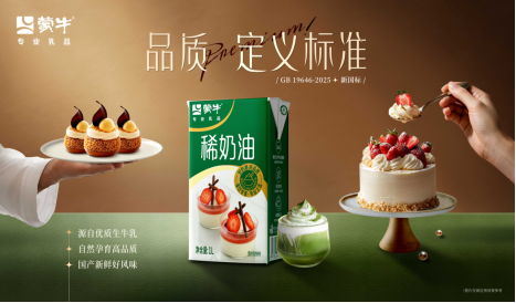 蒙牛专业乳品快速响应行业规范与消费需求推出新国标稀奶油。蒙牛新国标稀奶油以优质生牛乳为核心原料,自然孕育高品质,100%动物乳脂肪,每100g乳脂肪含量达36g,符合国家GB 19646-2025稀奶油新标准,适用茶饮、咖啡、烘焙等多元场景,重新定义乳品原料新标杆。