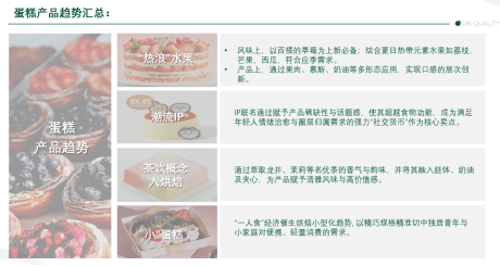 蛋糕品类以裱花蛋糕为主,通过应季水果元素、跨赛道风味融合及产品外观和形态的优化作为新品主要驱动: