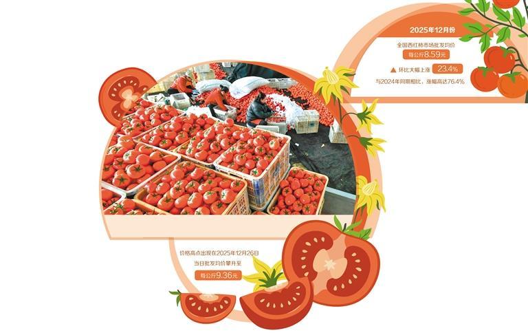 山东寿光市商务局党组成员隋立东介绍,寿光蔬菜价格指数显示,2025年12月中旬,西红柿价格达到9.66元/公斤的高位,12月底开始,西红柿价格陆续回落,截至2026年1月7日中午,西红柿平均价格为6.59元/公斤。