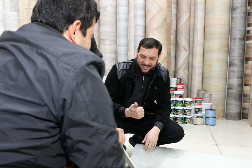 ↑12月12日,在乌兹别克斯坦首都塔什干,当地商家塔什普拉托夫(左)匹配与卷材地板同色的焊线。