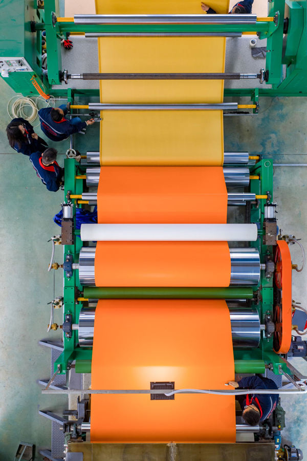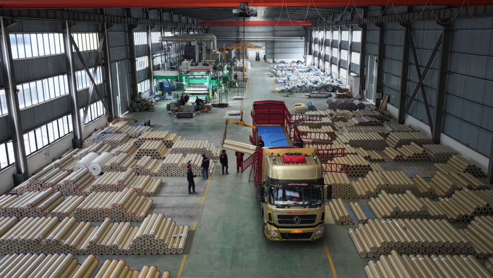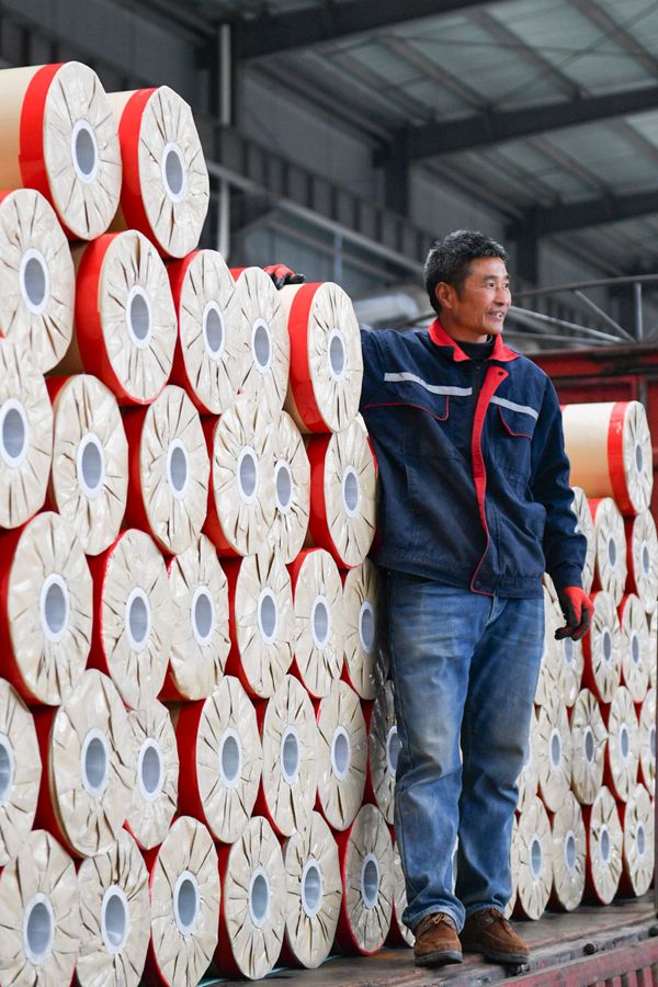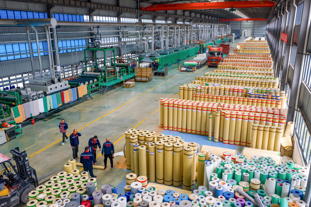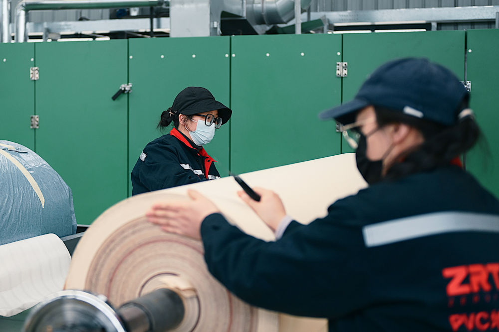 ↑12月12日,工人在四川省广元市一家卷材地板制造车间整理离型纸。