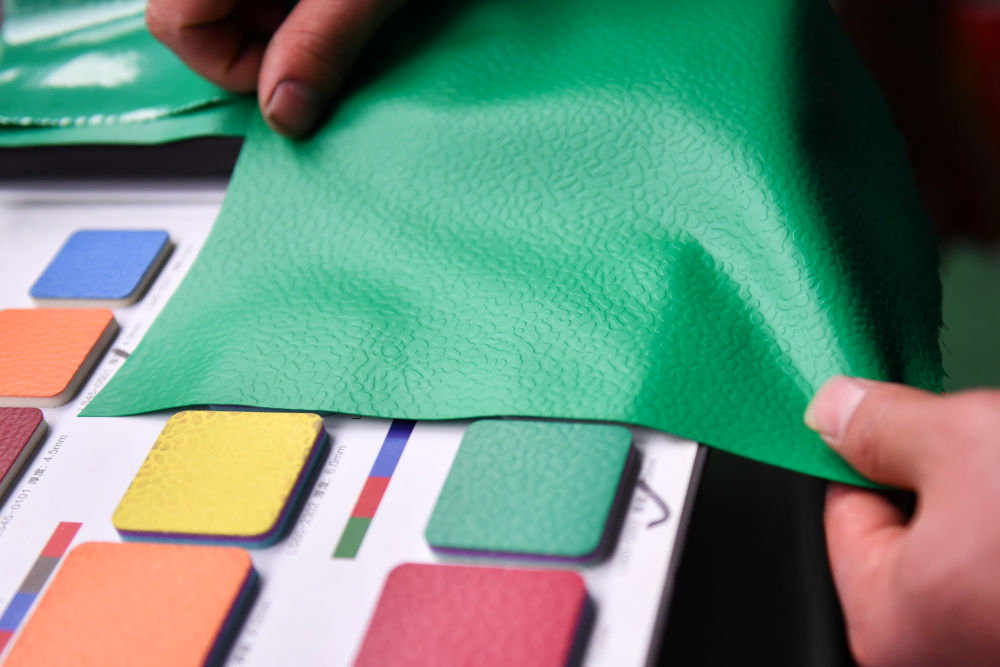 ↑12月12日,工人在四川省广元市一家卷材地板制造车间比对样品颜色。