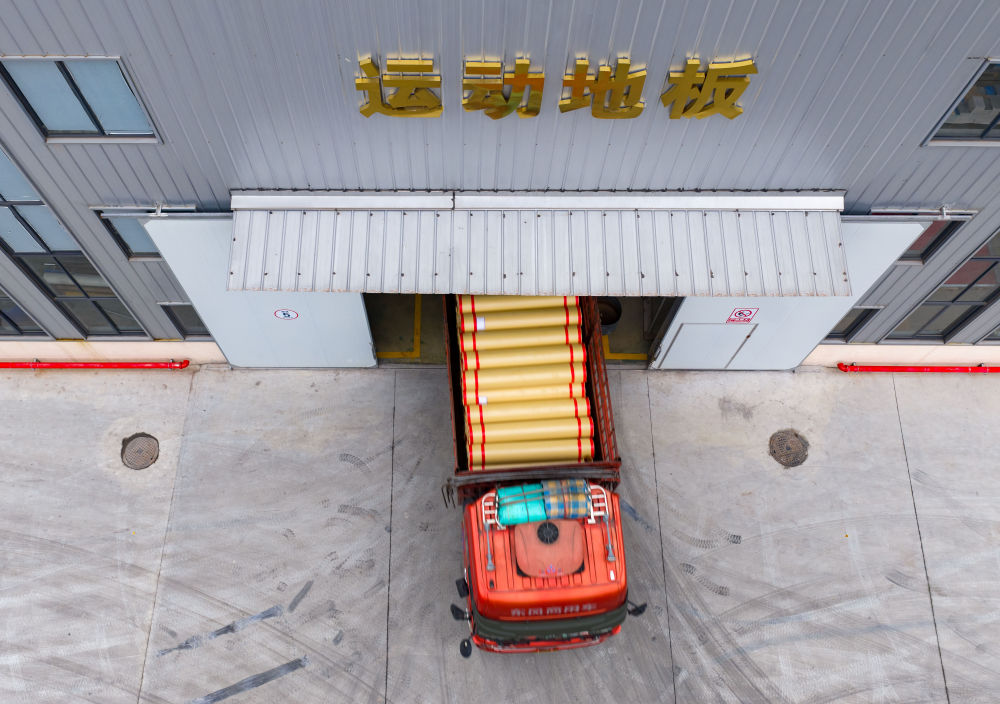 ↑12月12日,在四川省广元市,一辆载有卷材地板的货车驶出制造车间(无人机照片)。