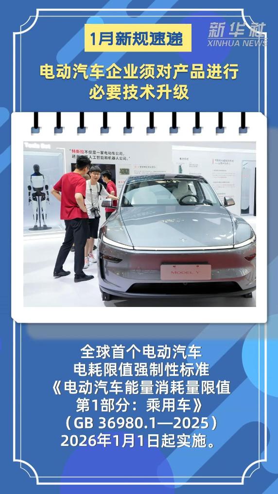 全球首个电动汽车电耗限值强制性标准《电动汽车能量消耗量限值 第1部分:乘用车》(GB 36980.1—2025)1月1日起实施。新标准实施后,企业必须对新出厂的产品进行必要的技术升级。以2吨左右的车型为例,新标准要求百公里电耗不应超过15.1度电,技术升级后,在电池容量不变的情况下,电动汽车的续航里程平均将提高约7%,驾驶者体验将得到显著改善。