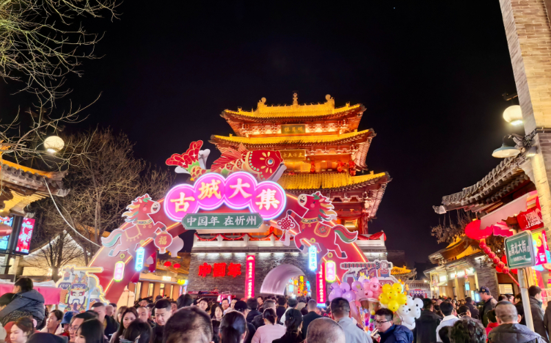 新华网北京2月28日电(记者 赵宇娇)“来到这儿,才真正像是过年啦!”游客蒲女士说。正月里的山西忻州古城处处欢歌笑语、人潮涌动。漫步在石板路上,沿街商铺的吆喝声、民俗表演的锣鼓声交织错落,陈醋味与炭火烤肉的香气萦绕鼻尖,这些有声、有色、有味的热闹场景,汇聚成浓郁的年味。