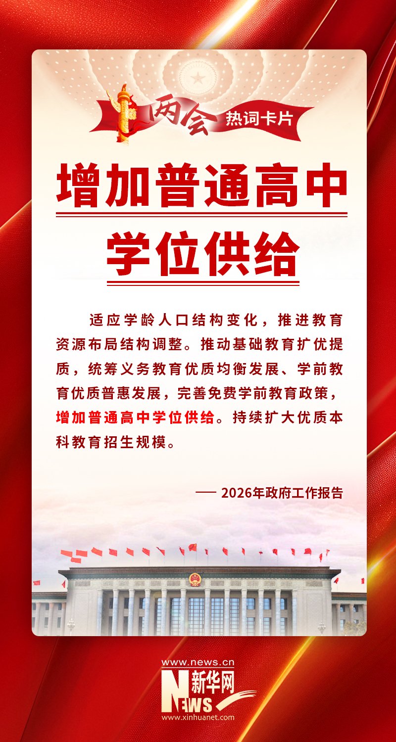 政府工作报告起草组负责人、国务院研究室主任沈丹阳:今年的政府工作报告明确,增加普通高中学位供给。具体来说,就是对人口持续净流入的县城和中心城区,将分年度规划建设一批普通高中;对学位缺口临时紧张的地区,将优先改扩建已有教学楼、学生宿舍和食堂。实际上,一些地方年初就已经对这项工作作出安排了,大家如果关注地方召开的两会就会看到,很多省都在这方面有安排。比如,广东提出新增普通高中学位20万个以上,湖南提出扩充优质普通高中公办学位8万个,这些将明显增加学生接受优质普通高中教育的机会。这就是一个实实在在的民生的事。