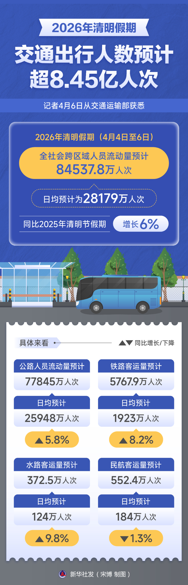 新华社北京4月6日电(记者叶昊鸣)记者6日从交通运输部获悉,今年清明假期(4月4日至6日),全社会跨区域人员流动量预计为84537.8万人次,日均预计为28179万人次,同比2025年清明节假期增长6%。