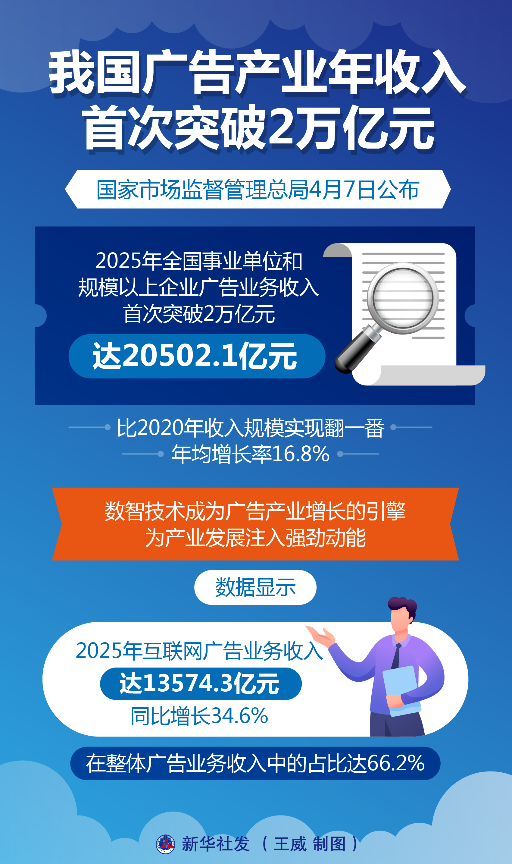 新华社北京4月7日电(记者戴小河、王悦阳)国家市场监督管理总局7日公布,2025年全国事业单位和规模以上企业广告业务收入首次突破2万亿元,达20502.1亿元,比2020年收入规模实现翻一番,年均增长率16.8%。