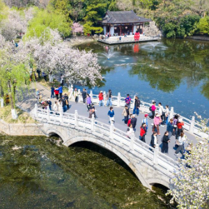 3月29日,游客在江苏南京莫愁湖公园赏花游玩(无人机照片)。新华社发(史俊 摄)