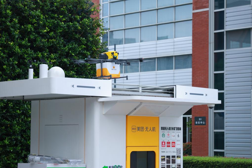 一架美团送餐无人机缓缓停在上海市杨浦区的一个智能空投柜上进行送餐。(受访者供图)