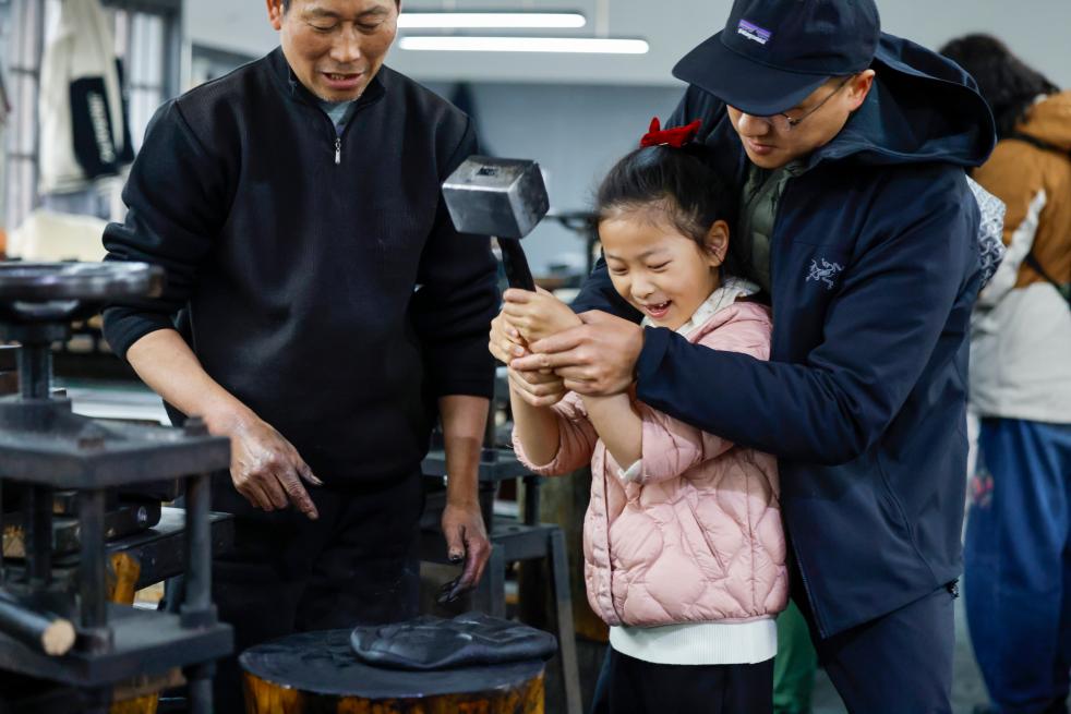 “来试试?捶墨力道要匀、节奏要稳,墨泥才细腻紧实。”周健笑着招呼来自上海的9岁小学生李一诺,他接过小铁锤轻轻落下,“原来徽墨要捶这么多下,太神奇了!”