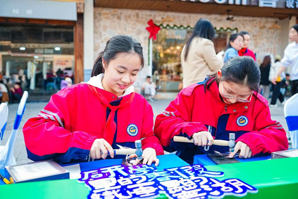 在位于安徽省芜湖市的芜湖古城街区,学生正在体验制作芜湖特色传统工艺品芜湖铁画。(受访者供图)