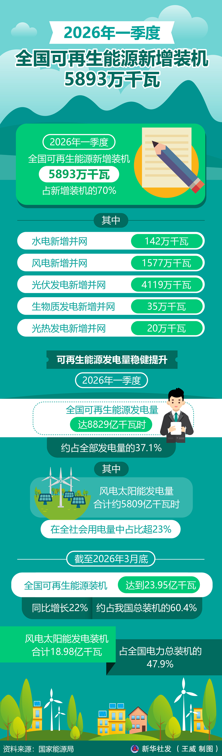 新华社北京4月27日电(记者 王悦阳)国家能源局新能源司副司长潘慧敏在4月27日举行的国家能源局例行新闻发布会上介绍,今年一季度,全国可再生能源新增装机5893万千瓦,占新增装机的70%。