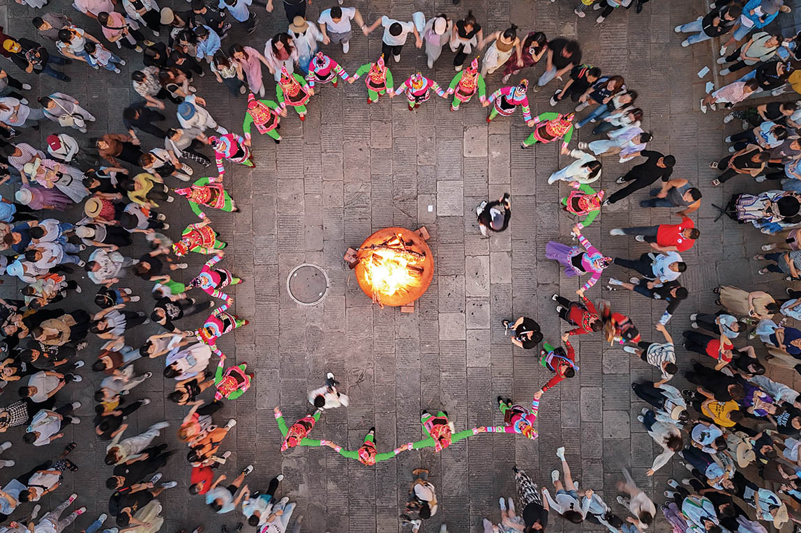 2025年7月18日,彝族打歌队在巍山彝族回族自治县拱辰楼广场与游客共舞(无人机照片)