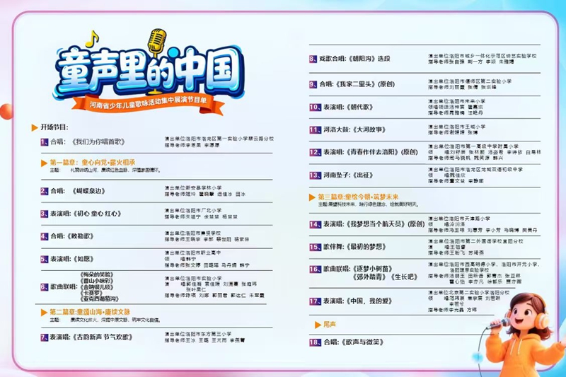 展演以“童声嘹亮 唱响中国”为主题,以“童心向党·薪火相承”“童颂山河·赓续文脉”“童绘今朝·筑梦未来”三大篇章展开,近二十所中小学的少年们,用清澈童声演绎经典旋律,用红色歌曲传唱信仰力量,通过合唱、戏曲、戏歌、非遗表演、原创节目等丰富形式,从《敕勒歌》的古韵回响到《我家二里头》的文明寻根,从《朝阳沟》的戏曲新唱到《逐梦九天》的科技畅想,孩子们用歌声传递对祖国的热爱,展现中原文化在新时代的青春传承,呈现河南少年对家国情怀的深情咏唱。