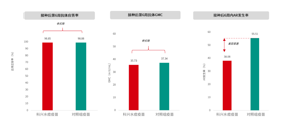 研究结果显示,科兴水痘减毒活疫苗的抗体应答率和几何平均浓度(GMC)均达到非劣效标准。组间不良反应的差异具有显著统计学意义,科兴水痘减毒活疫苗的不良反应发生率更低,尤其在接种部位红斑方面表现更优。此外,对照组报告了2例(0.82%)严重不良反应。