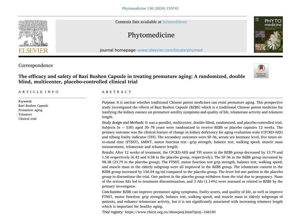《八子补肾胶囊治疗早衰的随机、双盲安慰剂对照、多中心临床研究》的论文在国际植物医学领域权威期刊《植物医学》上发表