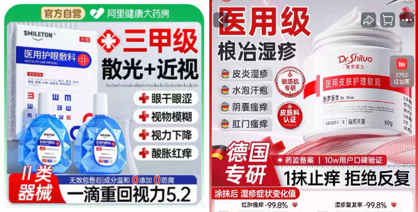 但2026年1月19日,九派财经记者搜索发现,阿里健康大药房中仍有部分医疗器械产品宣称“一滴重回视力5.2”“根治湿疹”“红肿瘙痒-99.8%”等,并标注胖东来同款;还有省妆备字的普通化妆品宣称“祛痘”等功效。