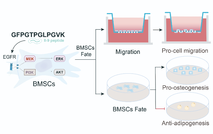 研究团队采用多肽结构鉴定、生物活性预测和验证、分子机理探究的综合策略,从专属于骨II型胶原蛋白的多肽库中鉴定出一条活性胶原蛋白肽(GFPGTPGLPGVK)。该肽通过结合并激活EGFR,进而启动下游与成骨相关的信号通路(PI3K/AKT和MAPK信号通路),从而定向诱导BMSCs向成骨分化,并有效抑制其成脂分化倾向。
