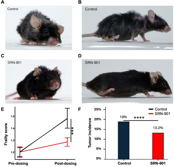 在SRN-901的研究中,科学家耗时5年对自然衰老的正常小鼠进行了全寿命周期的测量。数据显示,该药物使小鼠的衰弱进程大幅延缓了70%。在长达64周的治疗后,未受干预的老年小鼠出现了明显的毛发凌乱、驼背等生命末期衰弱体态,而服用SRN-901的小鼠依然保持着整洁的毛发、紧致的肌肤和正常的体态。此外,病理检查结果显示,SRN-901组小鼠的肿瘤发生率较对照组显著降低了30.53%。