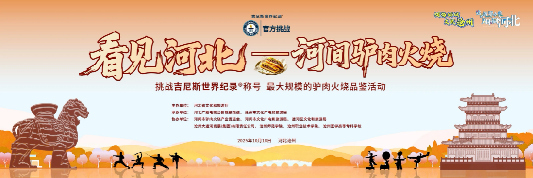 10月18日,“看见河北——河间驴肉火烧最大规模品鉴会吉尼斯世界纪录挑战活动”在沧州市南川老街朗吟楼南广场举行。此次活动由河北省文化和旅游厅主办,沧州市文化广电和旅游局、河北广播电视台承办,河间市驴肉火烧产业促进会、河间市文化广电和旅游局、运河区文化和旅游局等多单位协办,8家知名河间驴肉火烧品牌共同参与,旨在以美食为媒,通过创新形式与多元融合,打造一场具有广泛影响力与深远意义的城市文化盛宴,全方位提升沧州的城市知名度、美誉度与吸引力。