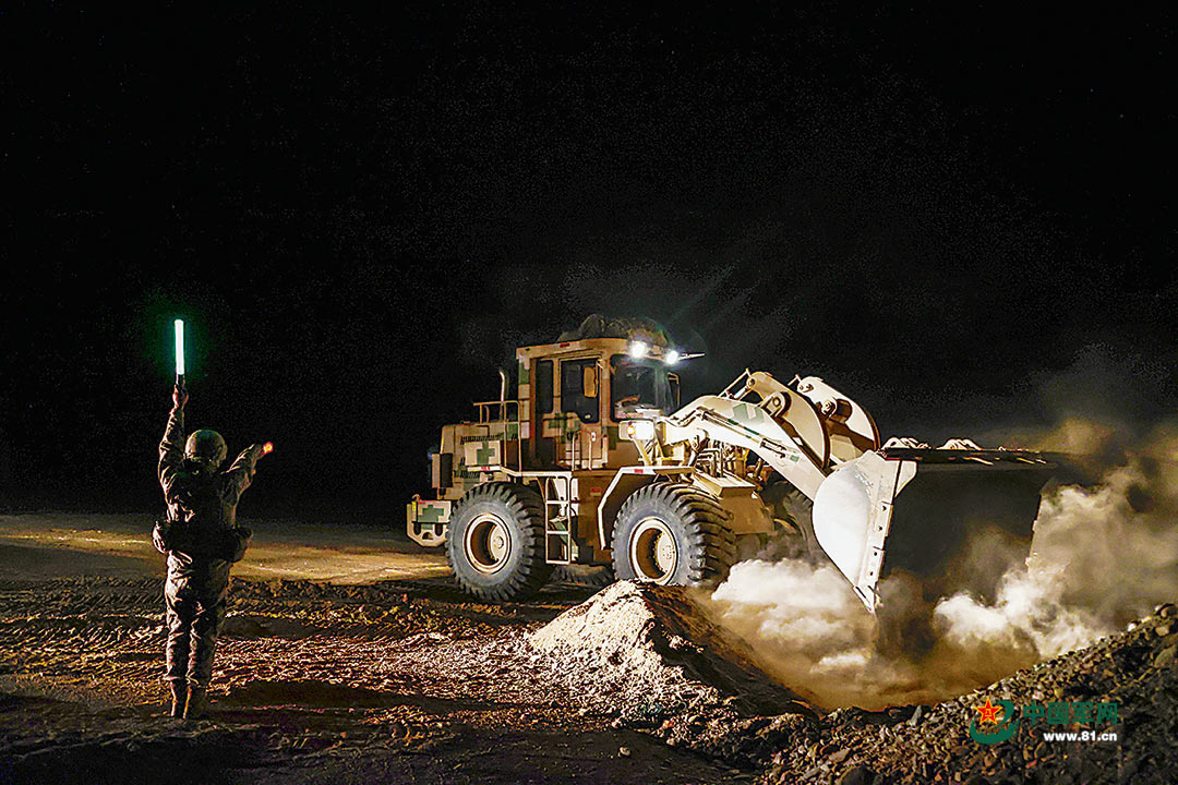 “前方道路发现多重障碍!”夜幕初降,新的行动指令传来。官兵立即转场,投入新的任务。指挥员沉着指挥,官兵操作各型工程机械展开攻坚:装载机铲除三角锥、推土机推倒土墙、平地机平整路面……