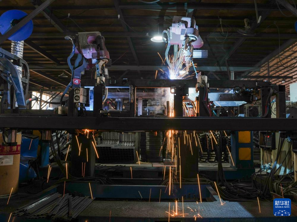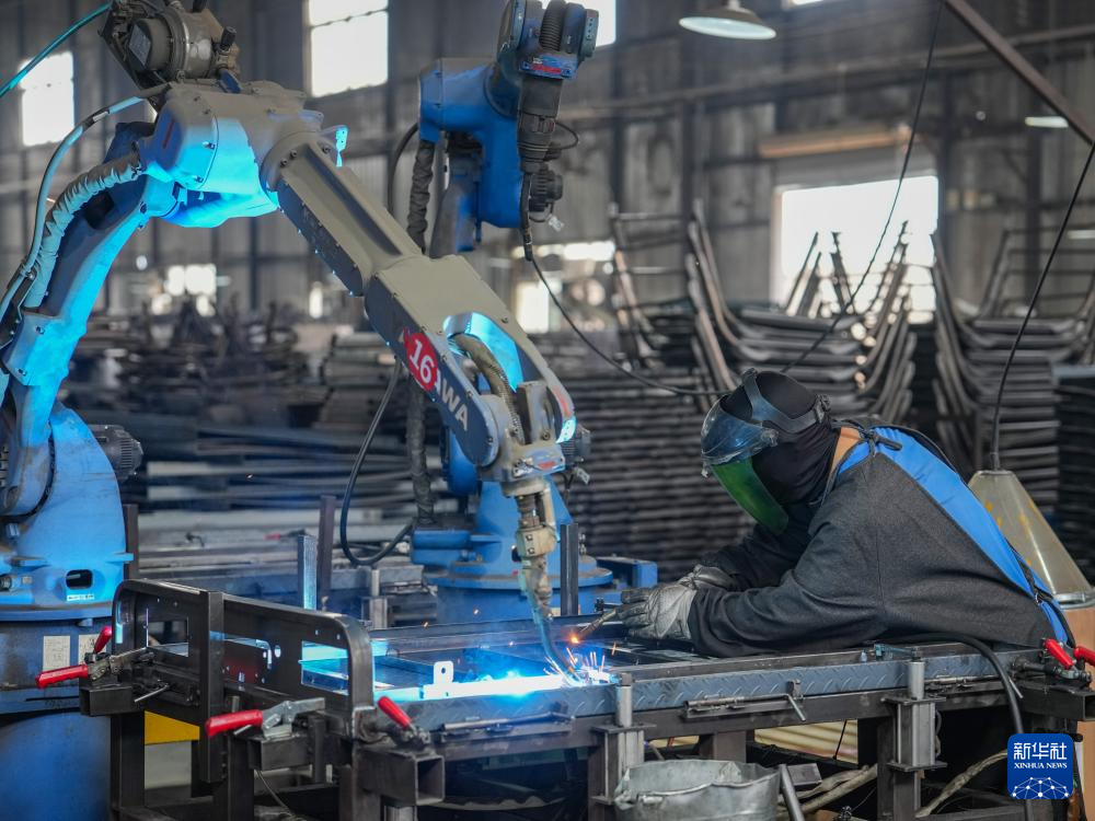 4月28日,在四川眉山天府新区视高工业园,机器人在焊接电动三轮车的车架。