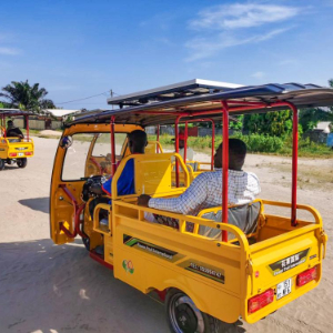 4月24日,在非洲刚果(布)黑角市,当地员工测试组装完成的电动三轮车。