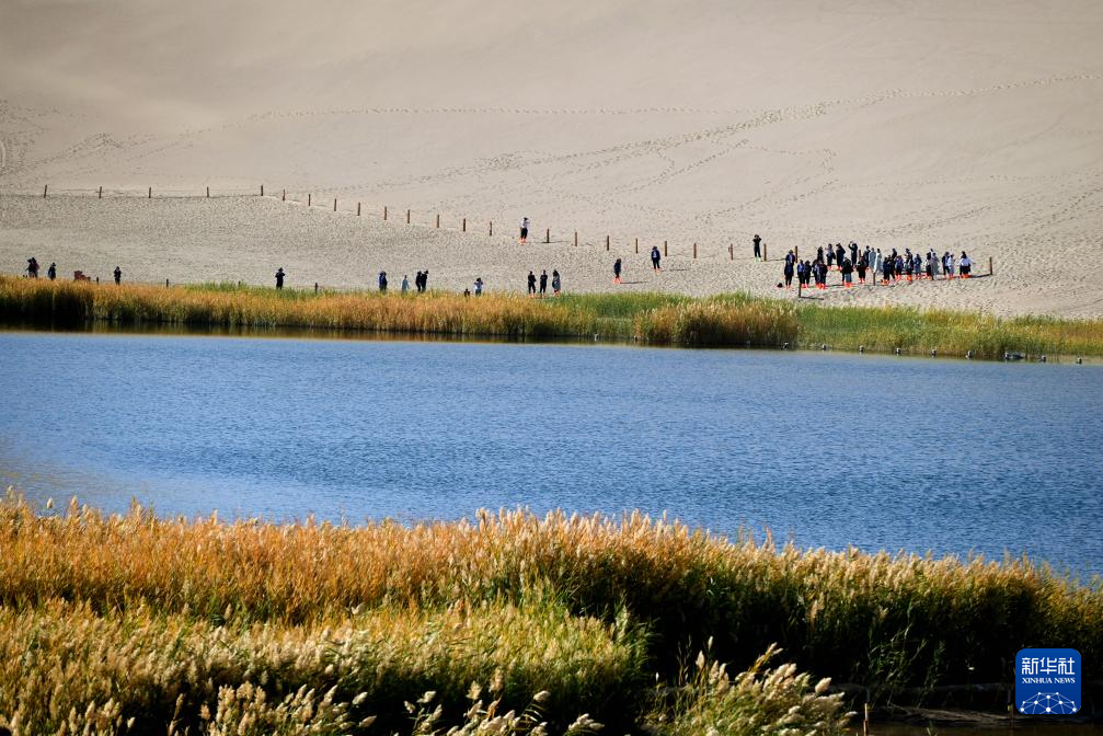 金秋时节,甘肃省敦煌市鸣沙山月牙泉景区景色如画,众多游客徜徉其中,感受大漠风情。
