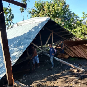 10月16日,在印度尼西亚巴布亚省萨米县,人们站在受损的房屋旁。