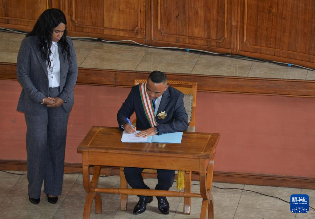 10月17日,在马达加斯加首都塔那那利佛,米夏埃尔·兰德里亚尼里纳(右)宣誓就任该国总统后在相关文件上签字。