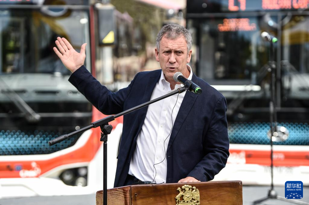10月16日,在智利科皮亚波,智利交通和电信部长胡安·卡洛斯·穆尼奥斯在新能源公交车辆启用仪式上讲话。