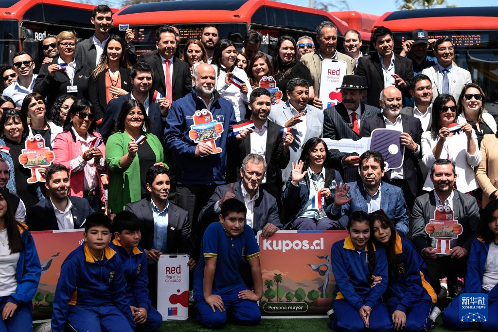 10月16日,在智利科皮亚波,人们在新能源公交车辆启用仪式上合影。