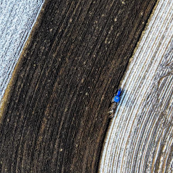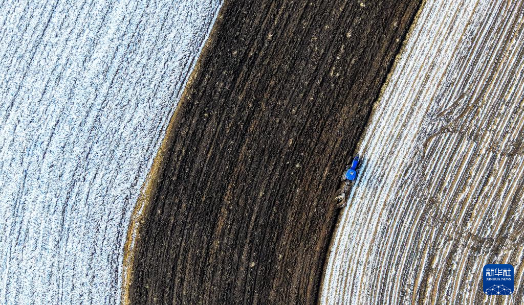 10月17日,在北大荒集团黑龙江建设农场有限公司第二管理区,机车在覆盖积雪的耕地上进行整地作业(无人机照片)。