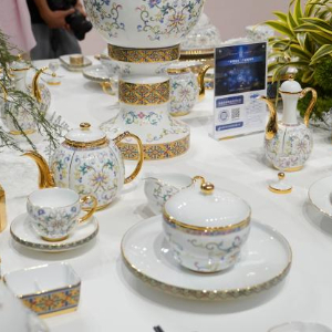 这是陶瓷博览会展区展出的餐具(10月18日摄)。